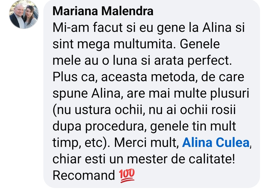 Mă numesc Alina Culea și mai întâi de toate sunt mamă a 2 copii minunați, un soț care mă susține în toate. Sunt Trainer Acreditat Internațional. Activez într-un salon de frumusețe ca stilist de gene și sprâncene, mai exact: extensii gene, laminare gene și sprâncene, stilizare și vopsire cu henna.Întotdeauna mi-a plăcut ceea ce fac.Mereu tind să cresc, să mă dezvolt în acest domeniu.